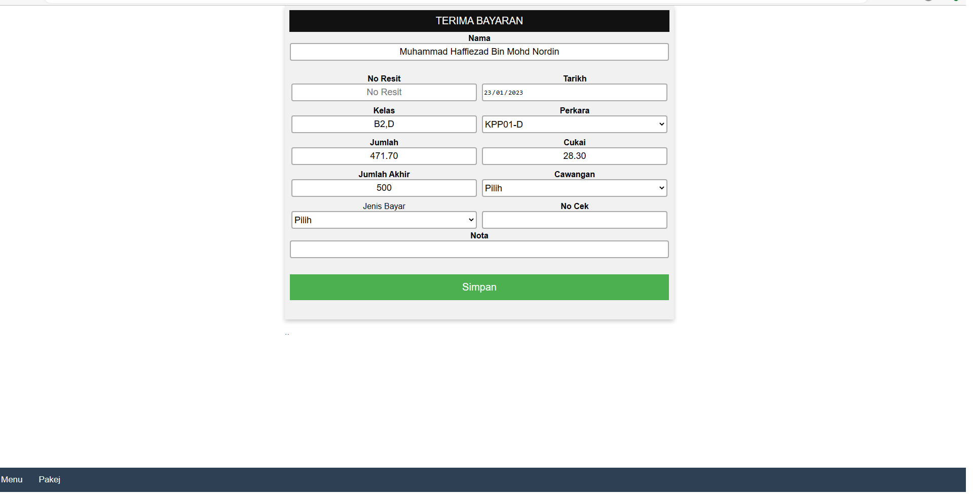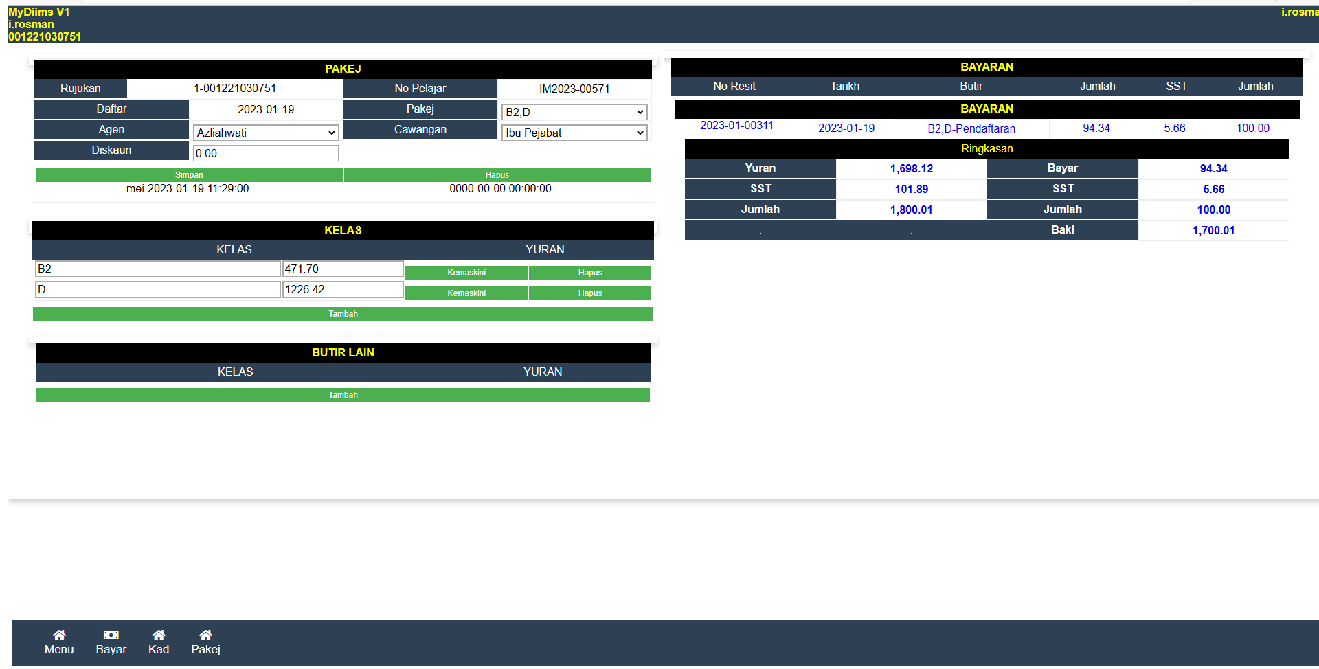 Skrin ini memaparkan maklumat pakej pendaftaran calon