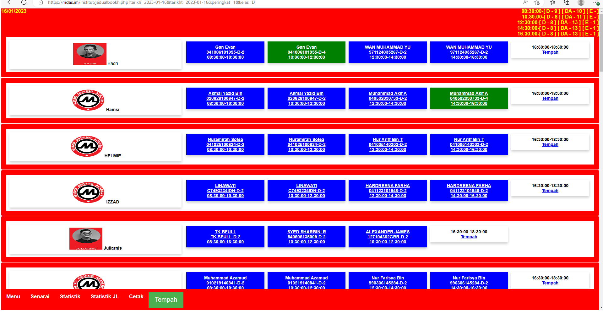 Warna Putih Menunjukan kekosongan slot, Selain Warna Putih Slot telah di isi dengan calon lain atau aktivit jurulatih seperti cuti tahunan, mingguan , Ujian JPJ dan Lain-Lain