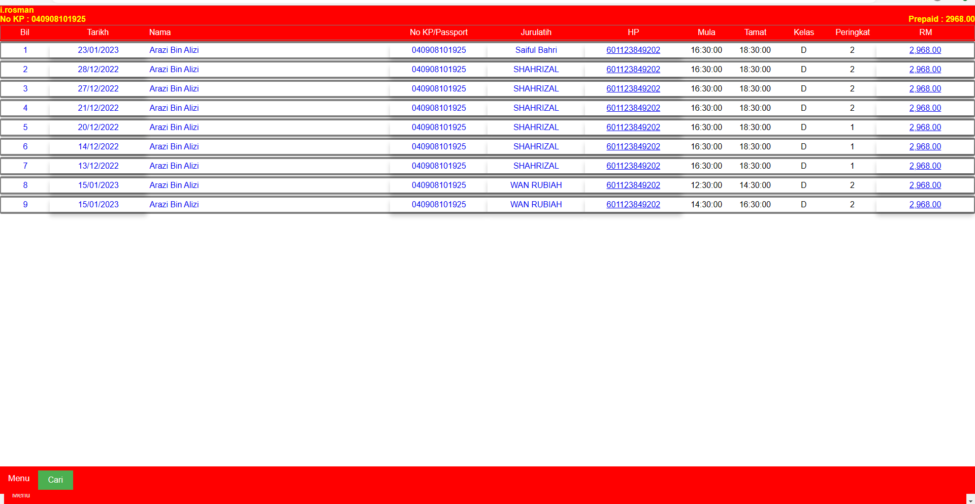 Skrin ini memaparkan senarai latihan bagi semua kelas calon.