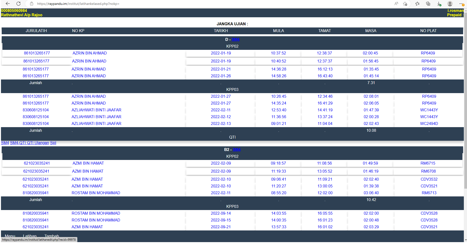 Skrin ini memaparkan rekod kehadiran latihan oleh calaon