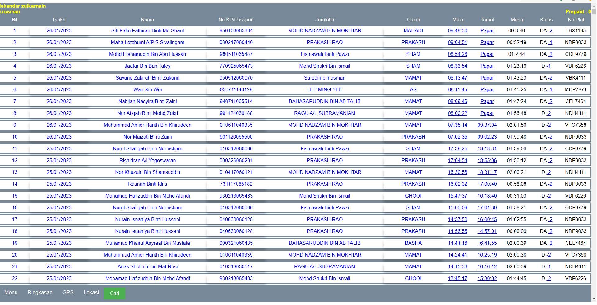 Memaparkan senarai Latihan Menggunakan Sistem Log Kenderaan