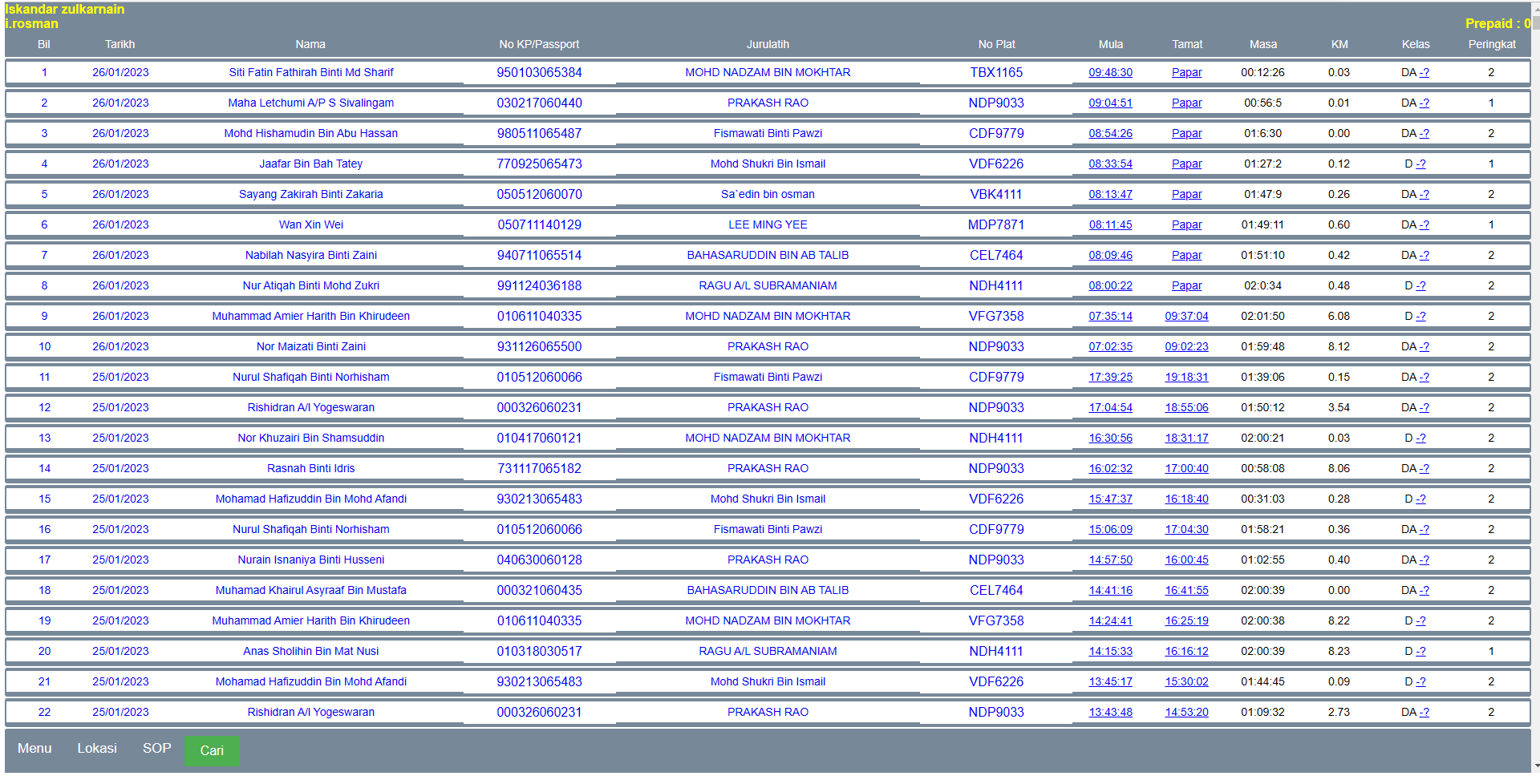 Skrin ini memaparkan senarai latihan yang menggunakan Sistem Log Kenderaan