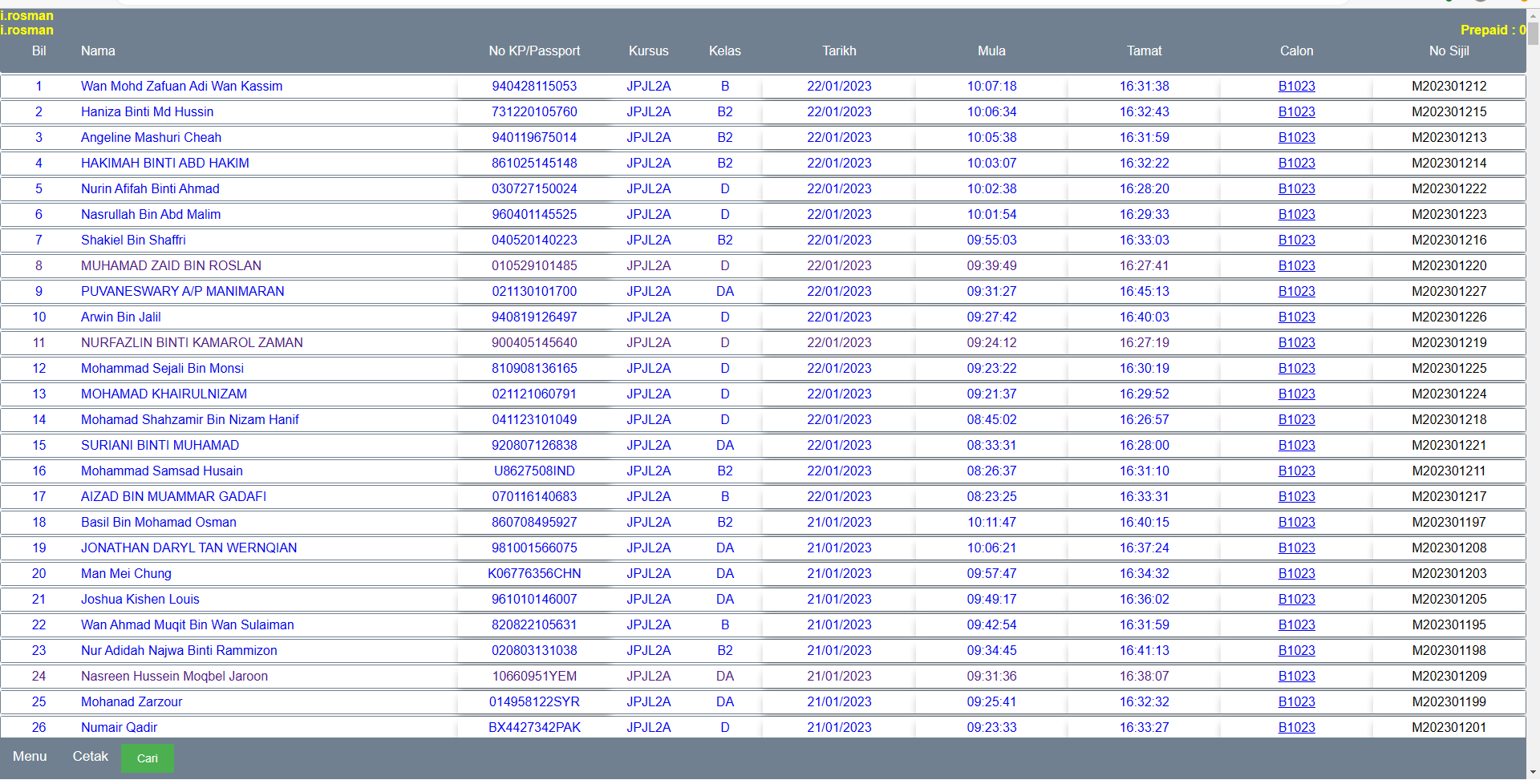 Skrin ini memaparkan senarai kehadiran Kursus Biometric seperti KPP01 dan Bengkel Lori