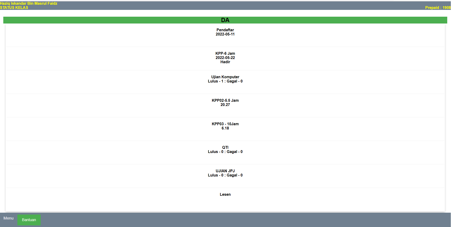 Skrin ini memaparkan Status Terkini Pelajar dari Pendaftaran hingga Ujian